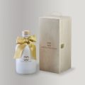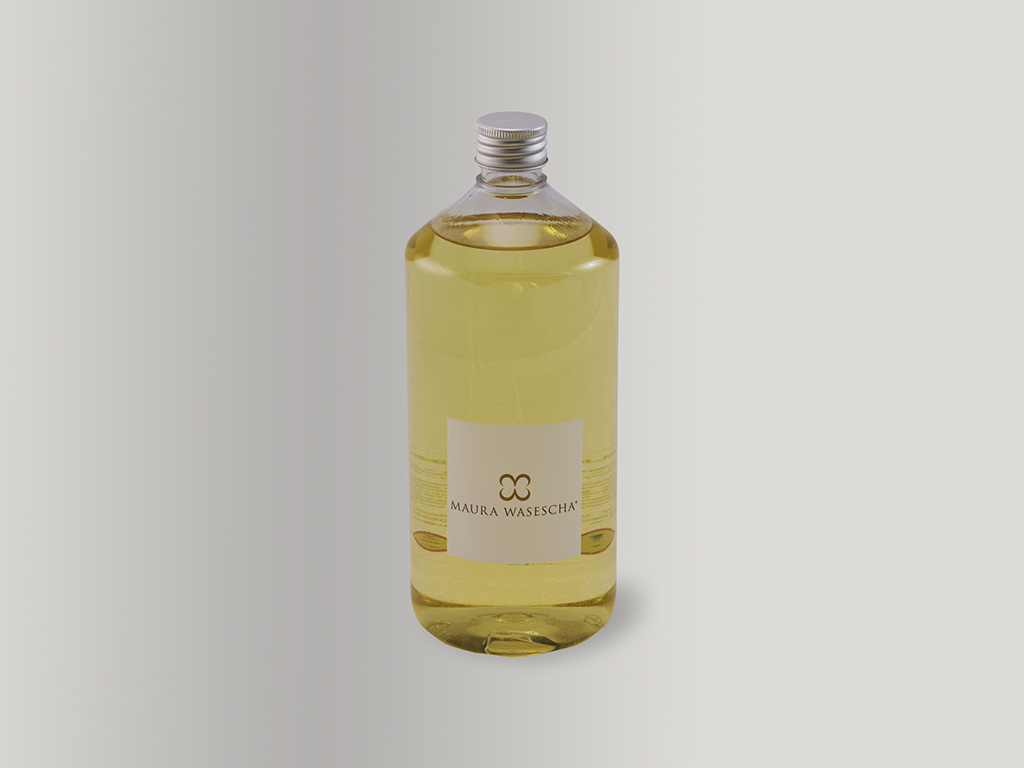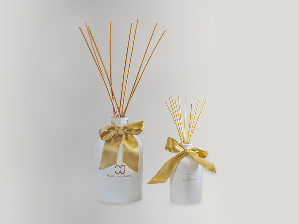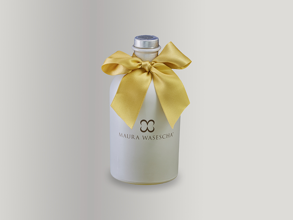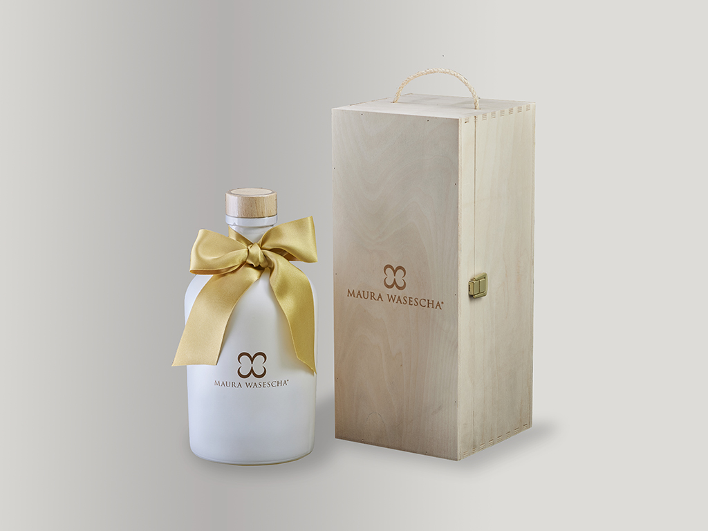 Eau d’Engadine ,made of nuances from Asia, Alps and the Mediterranean. Caressed by a silk satin flake. Enlightened by a beat of wings in gold leaf. A surprise in solid wood, symbol of Maura Wasescha’s world in evolution.